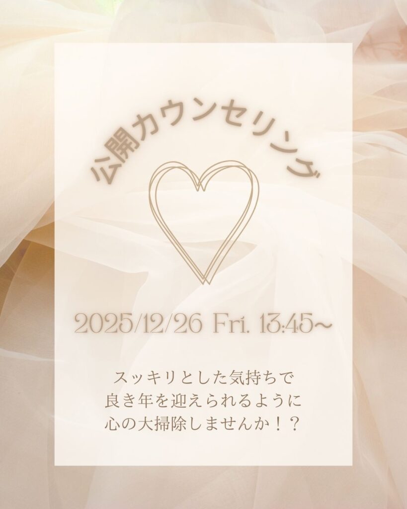 【有料会員様限定】2025年12月26日(金)13:45〜霊視カウンセラー尚による公開カウンセリングを開催いたします。募集人数は15名とさせていただきます。